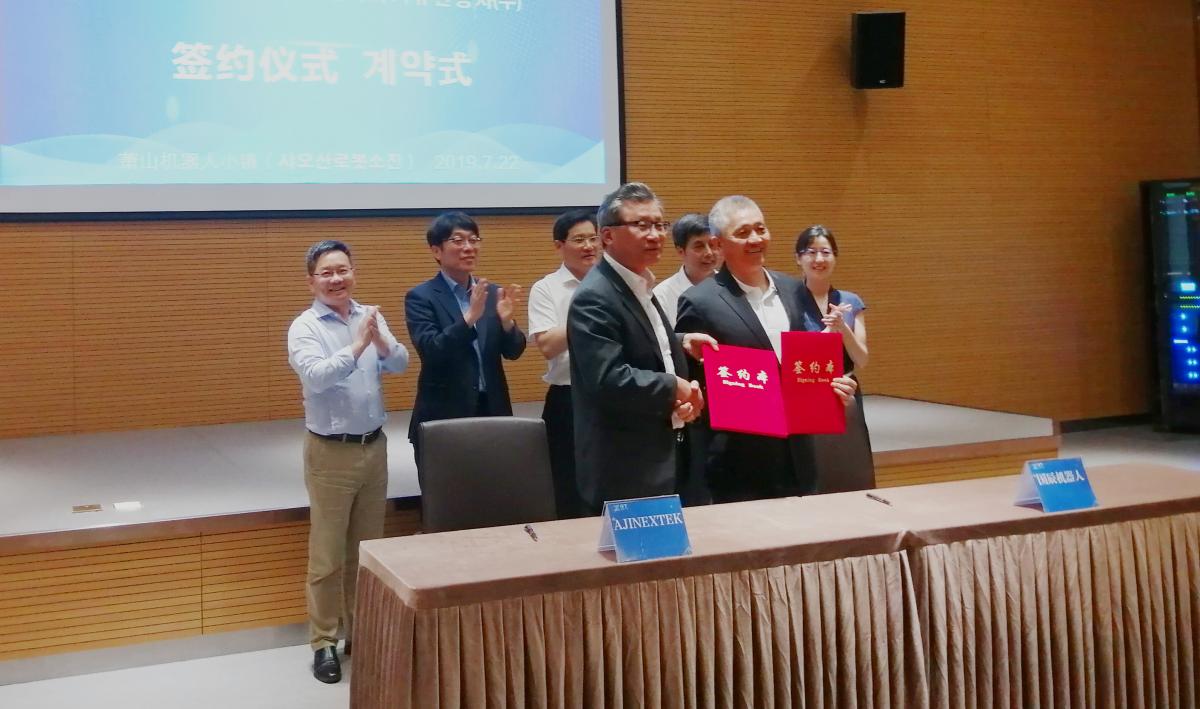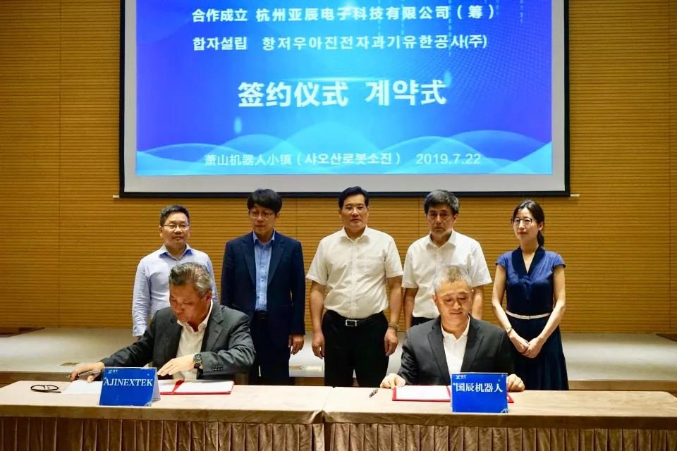 【國(guó)辰訊】2019年7月22日,杭州國(guó)辰機(jī)器人科技有限公司與韓國(guó)(株)亞進(jìn)EXTEK合作成立合資公司簽約儀式在蕭山機(jī)器人小鎮(zhèn)隆重舉行。蕭山經(jīng)濟(jì)技術(shù)開(kāi)發(fā)區(qū)黨工委委員、管委會(huì)副主任徐建中,開(kāi)發(fā)區(qū)招商局副局長(zhǎng)、機(jī)器人小鎮(zhèn)工作組負(fù)責(zé)人陳笑,浙江省機(jī)器人產(chǎn)業(yè)發(fā)展協(xié)會(huì)秘書(shū)長(zhǎng)王國(guó)耀,韓國(guó)大慶機(jī)器人振興社會(huì)長(zhǎng)金昌浩,杭州國(guó)辰機(jī)器人科技有限公司首席戰(zhàn)略官王國(guó)成、韓國(guó)(株)亞進(jìn)EXTEK常務(wù)崔成赫等出席簽約儀式。
